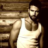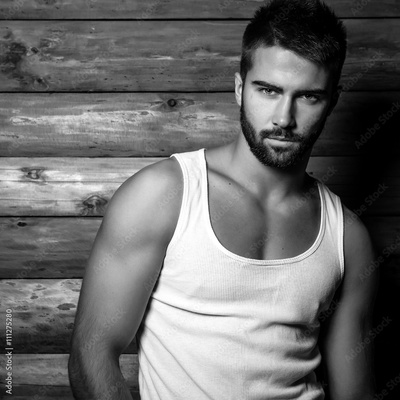Black-white portrait of young beautiful fashionable man against wooden wall.