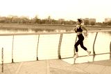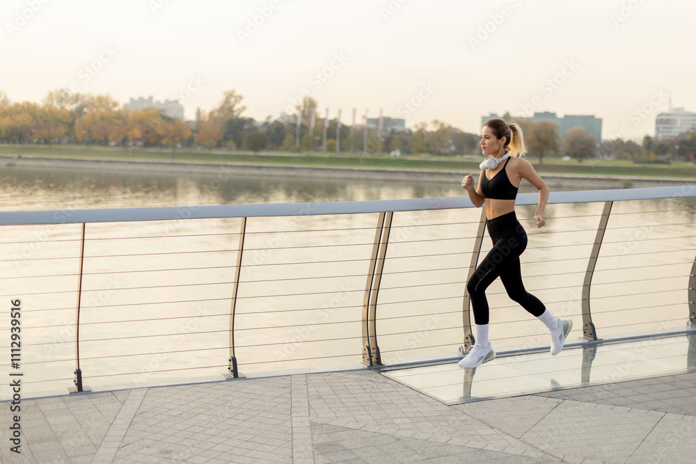 Early morning jogger enjoys a brisk run along a scenic waterfront pathway at sunrise in a vibrant urban park setting