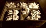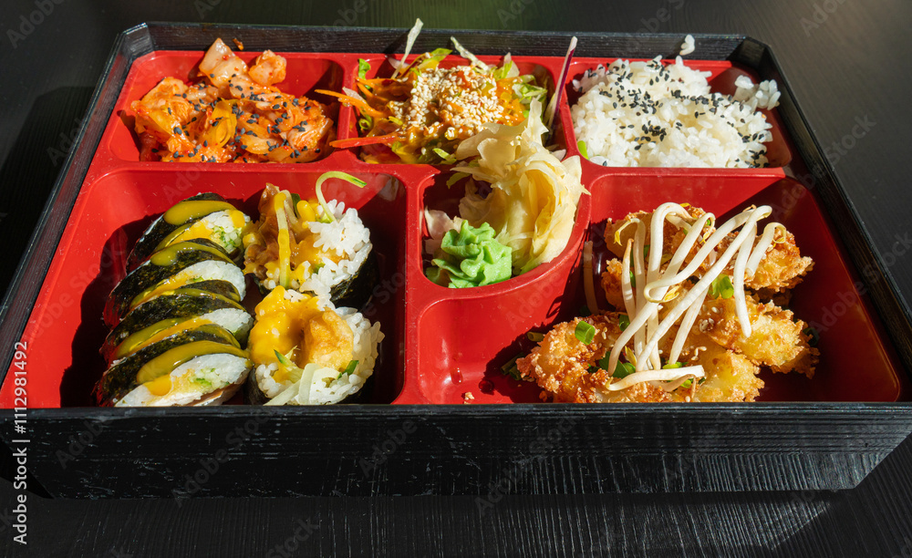 Japanese Lunch in Bento Box with Deep-Fried Squid Rings, Sushi Rolls, Salad, Rice, Pickled Ginger