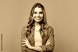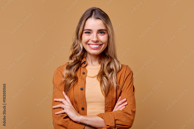 A smiling young woman stands confidently with arms crossed, looking stylish and relaxed