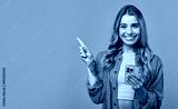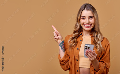 A Smiling Young Woman is Enthusiastically Pointing at an Invisible Object While Holding a Smartphone