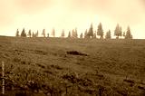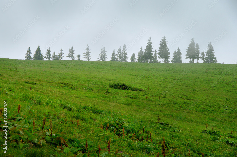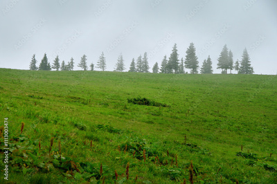 Carpathians hill pasture with silhouettes of spruce trees on the horizon in the fog,