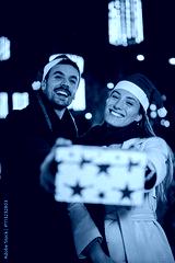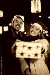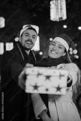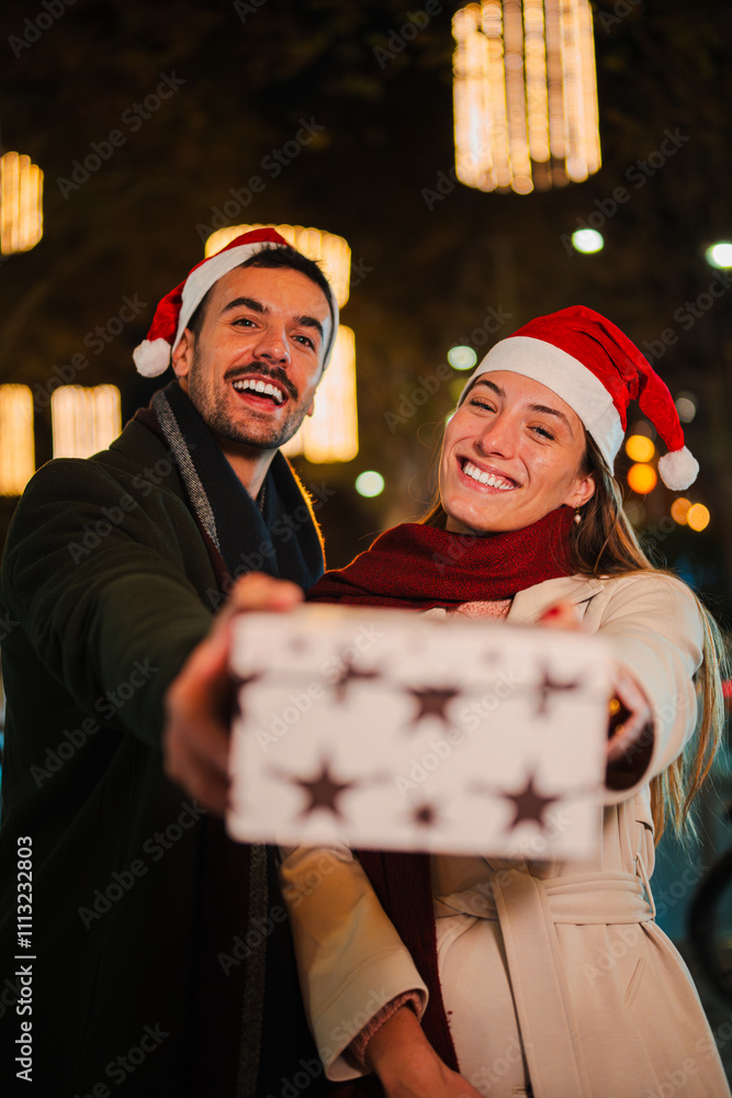 Vertical. Joyful Couple Wearing xmas Santa Hats Happily Holding a Gift Wrapped Box, Radiating Holiday Cheer and Excitement as They Stand Together on a Festive, Lighted Winter Christmas Night
