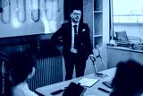 A confident businessman using crutches leads a multiracial team meeting in a modern office, presenting data on a large screen. Team members focus attentively on the discussion.