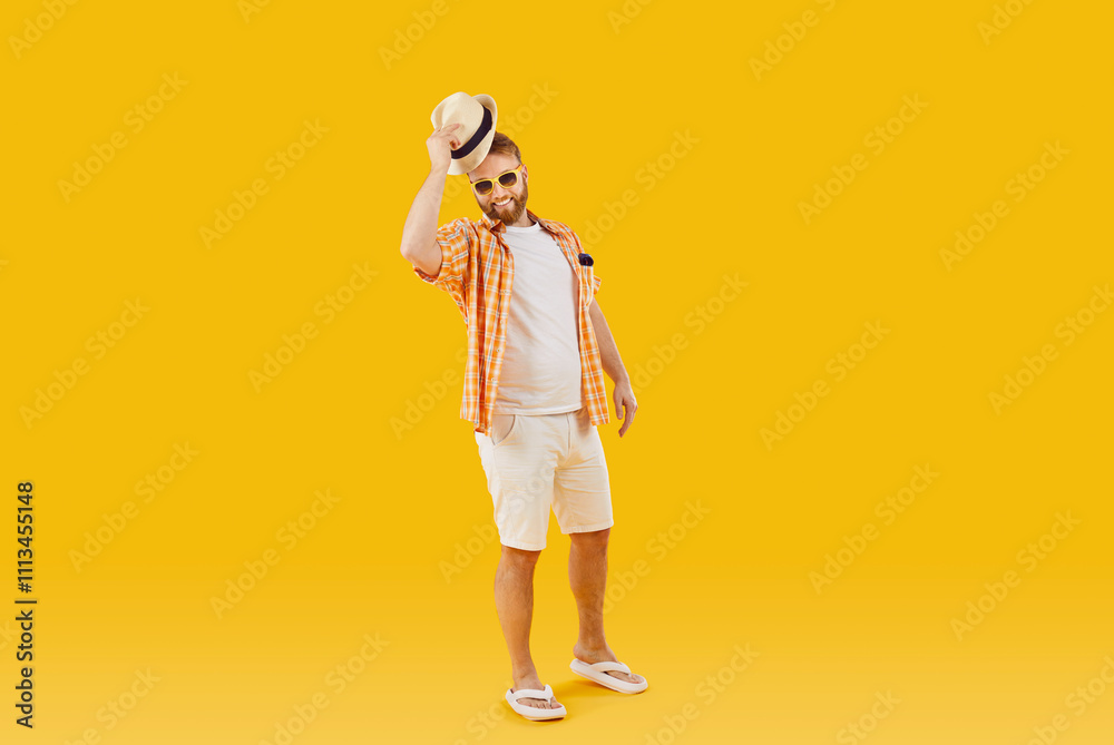 Full length portrait of a man in summer clothing and sunglasses, smiling at the camera and tipping hat, on orange background. He embodies the joy of vacation and travel, ready for a beach holiday.