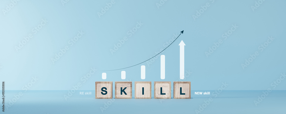 skills icon on wooden cube. Upskilling and personal development concept. Skill training, education, learning, ability. Upskilling, reskilling,