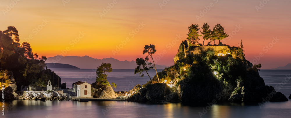 Ruins on a small island near the resort of Parga, Greece-night photography