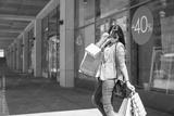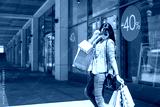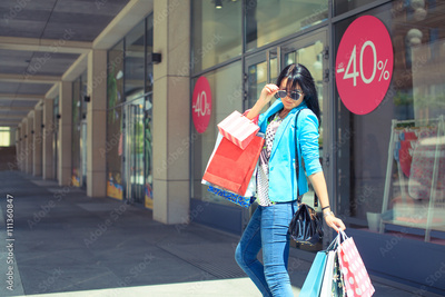 Happy woman holding shopping bags and smiling at the mall