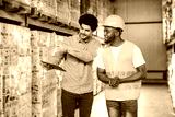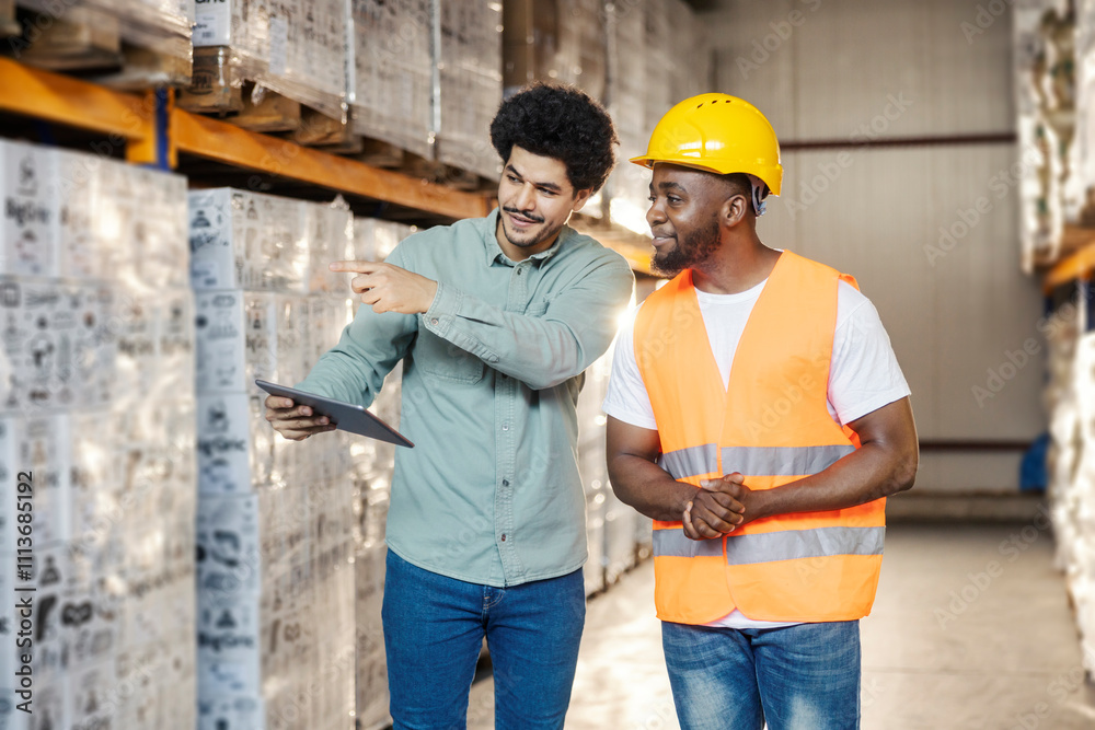 Young diverse storage manager with tablet talking to his migrant black worker at warehouse.