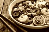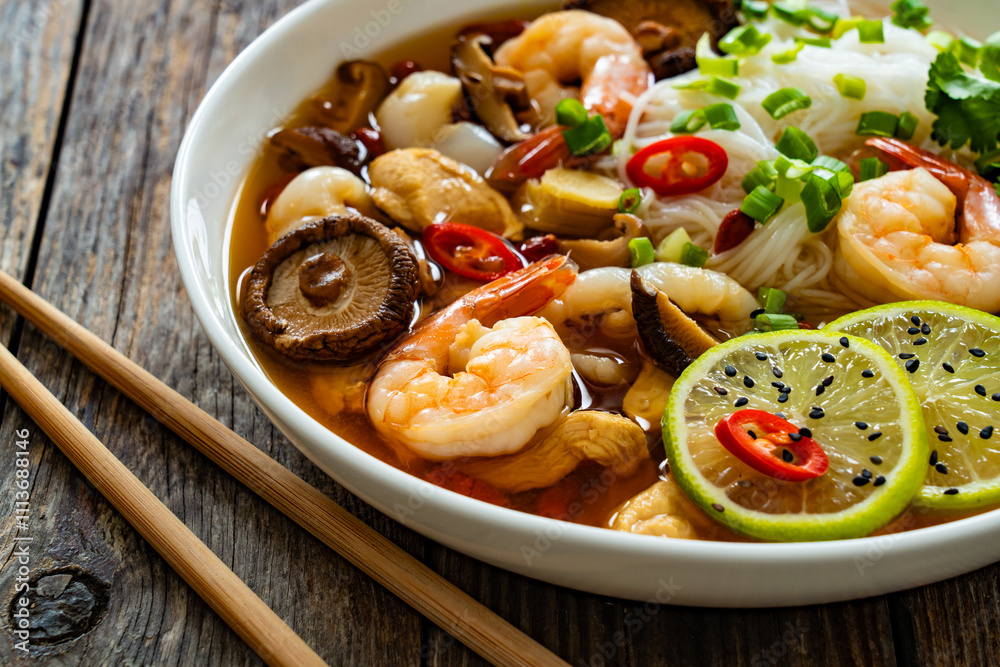 Yunnan hot pot - Chinese soup with chicken breast and shrimps on wooden table
