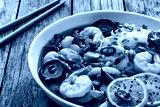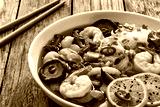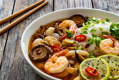 Yunnan hot pot - Chinese soup with chicken breast and shrimps on wooden table