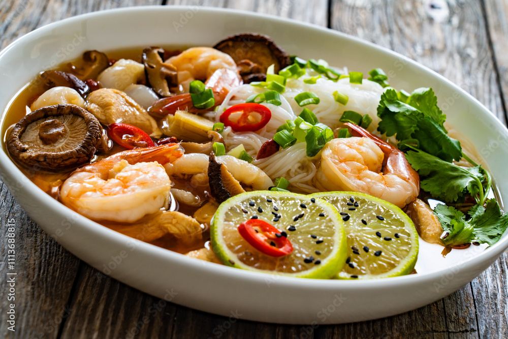 Yunnan hot pot - Chinese soup with chicken breast and shrimps on wooden table