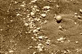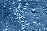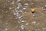 Shells in sand texture background. Seashell on sandy beach nature pattern, ocean dune clams in sunny day