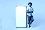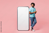Full body young Indian man he wear blue t-shirt casual clothes stand near big huge blank screen mobile cell phone with area use smartphone isolated on plain pastel pink background. Lifestyle concept.
