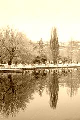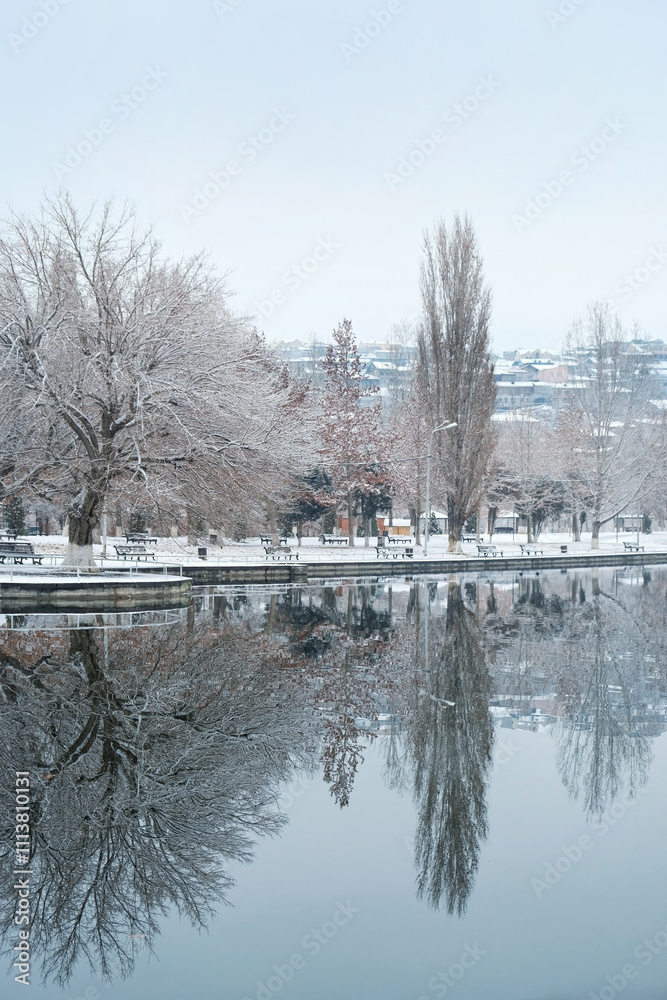 Beautiful landscape of lake and autumnal trees in park. reflection in water. autumn park in late autumn or early winter season. cold frozen weather atmosphere nature. harmony peaceful image
