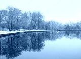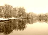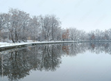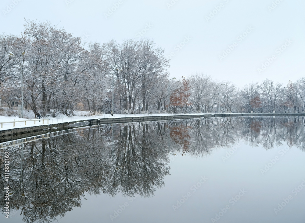 Beautiful landscape of lake and autumnal trees in park. reflection in water. autumn park in late autumn or early winter season. cold frozen weather atmosphere nature. harmony peaceful image