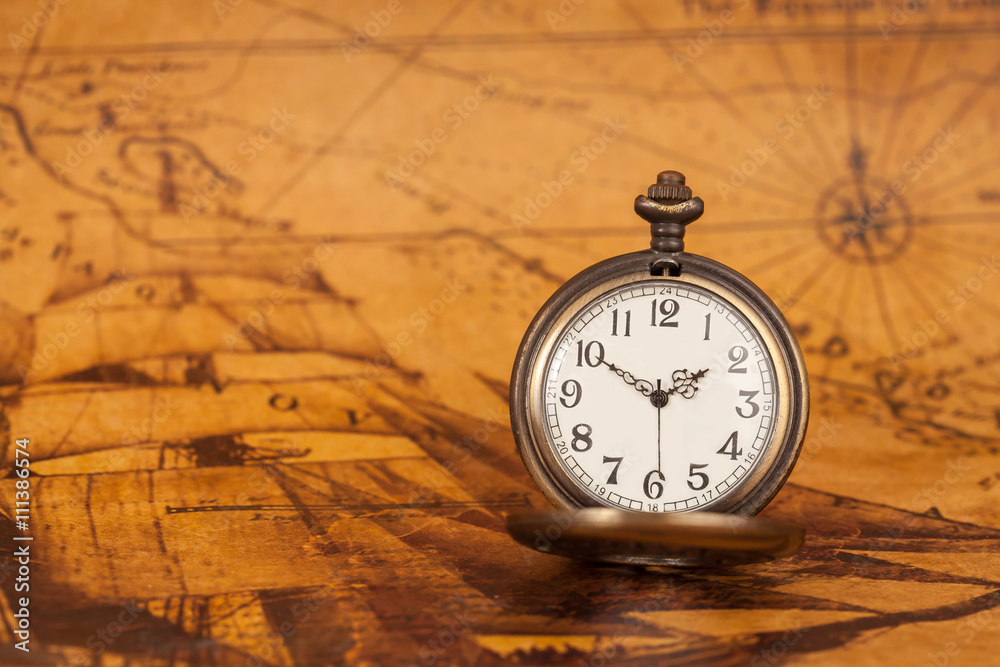 Pocket watch on old map background, vintage style light and tone
