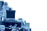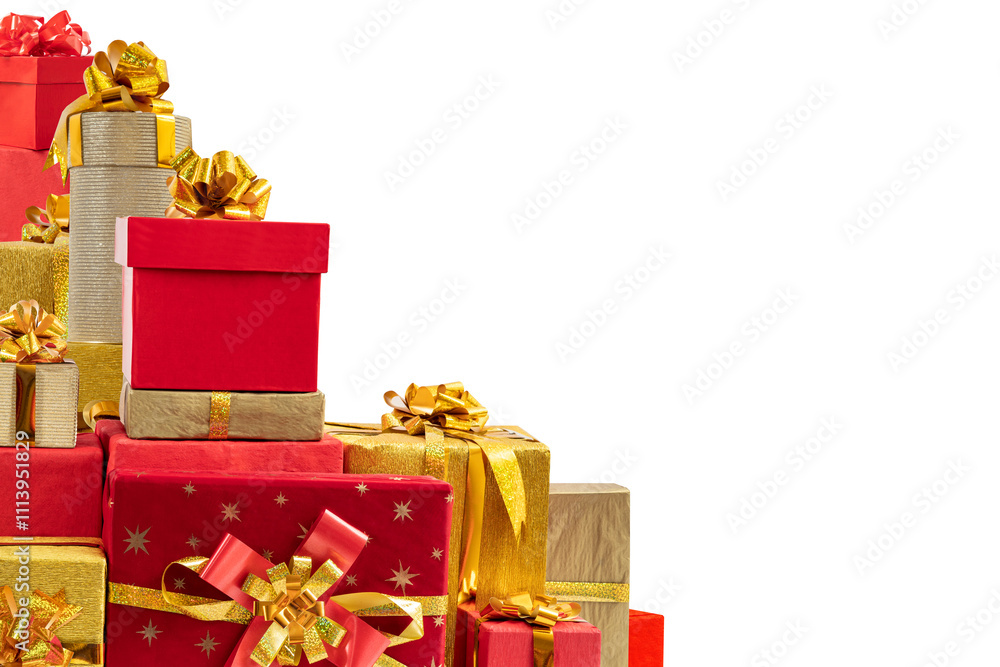 Golden and red gift boxes for holidays, birthday, promotions, christmas, new year, wedding. Elegant luxury wrappers, lush bows on isolated background.
