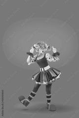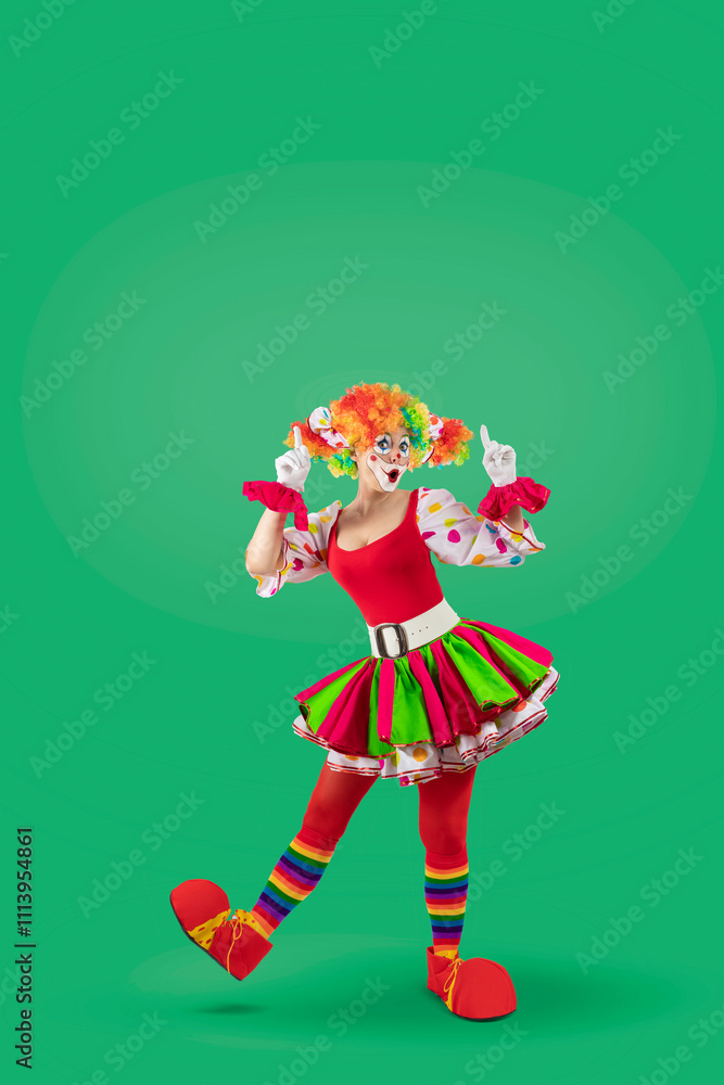 Surprised female clown pointing up at blank template copy spase for advertising, posters, greetings, invitations. Entertainer as Joker in a suit and wig, with clown whiteface makeup