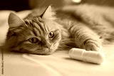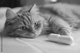 Cute ginger cat resting on bed with a white capsule nearby, cozy scene suggesting pet care or relaxation