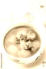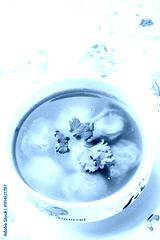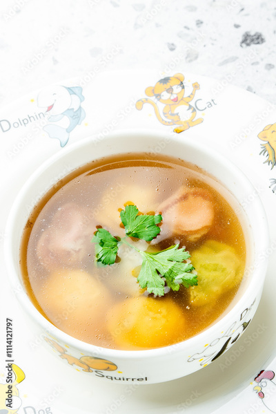 A bowl of flavorful soup featuring colorful dumplings, garnished with fresh cilantro. The dish is served in a playful, illustrated bowl, perfect for food-related themes.
