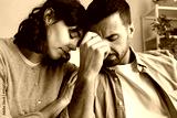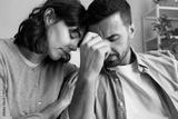 Close up of woman comforting husband.
