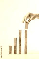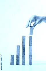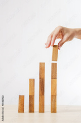 Close up Woman hand arranging wood block stacking as step stair. Business concept growth success process.