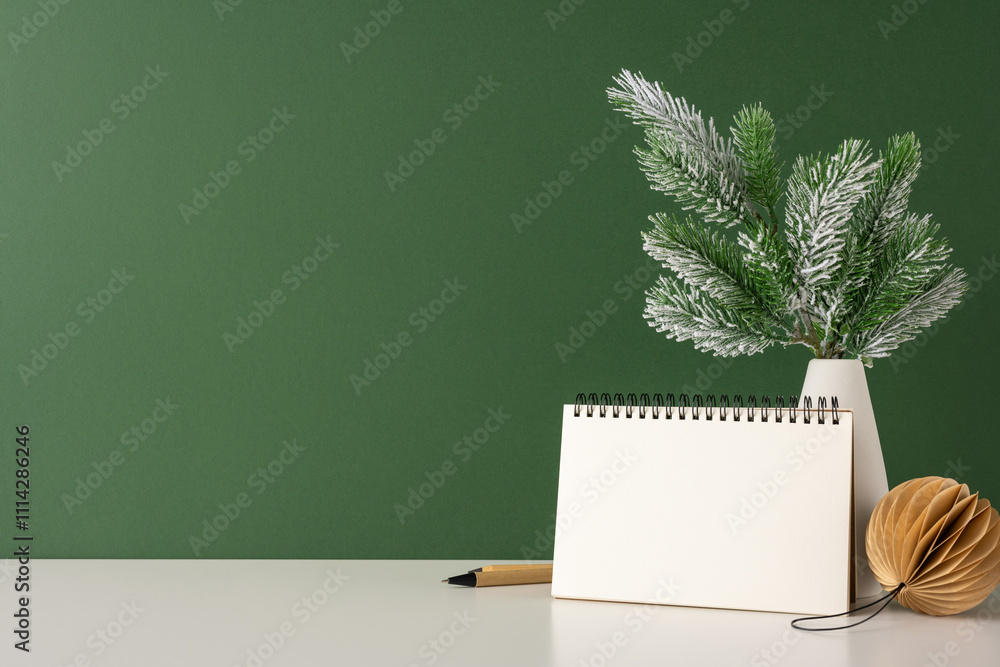 A minimal side view workspace featuring a spiral notebook, pencil, and vase with winter greenery. Set against a green background, this scandinavian style setting conveys calmness and simplicity