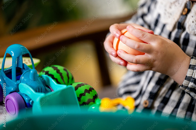 A child plays with colorful toy vegetables, enhancing fine motor skills and creativity. The vibrant plastic fruits and vegetables are arranged on a table, perfect for imaginative play.