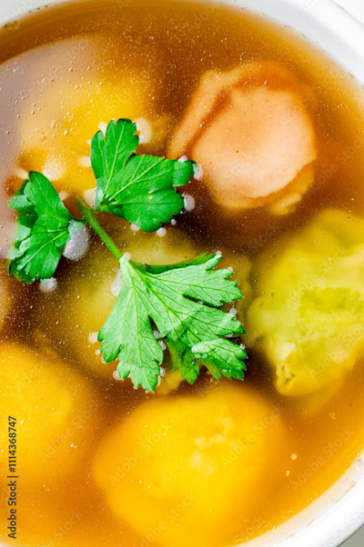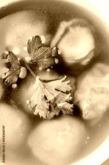 A close-up of a bowl of soup featuring dumplings and potatoes, garnished with fresh coriander. The warm, inviting broth glistens, creating a cozy, appetizing presentation.