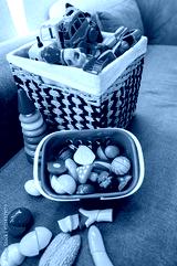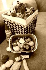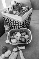 A colorful collection of children's toys, including a variety of vehicles and food items, is displayed in woven baskets. The vibrant stackable rings add playful charm to the scene.