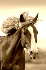 Beautiful red horse with long mane portrait in motion