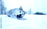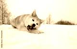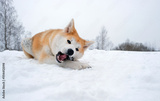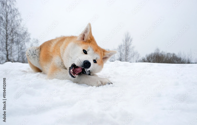 Akita inu dog lying on snow, winter natural background. portrait of cute red Japanese dog, gnawing on a treat, relax outdoor in winter day. happy pet life, care of domestic animal concept