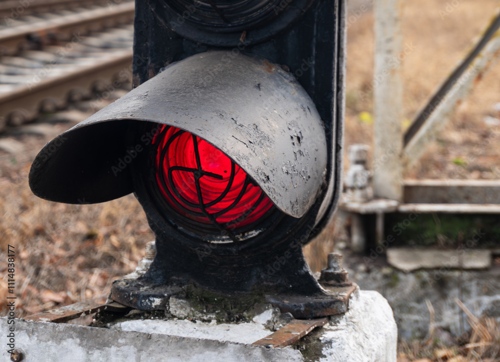 Red traffic light for trains close-up.