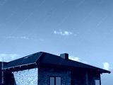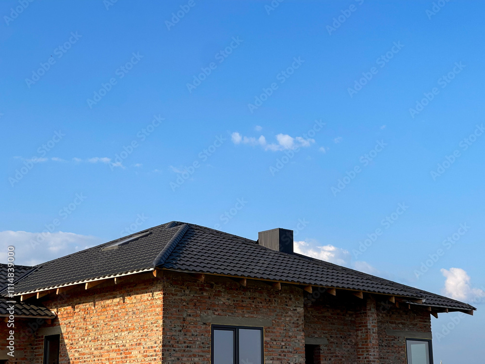 Four-pitched roof against the sky. The roof is made of metal tiles.