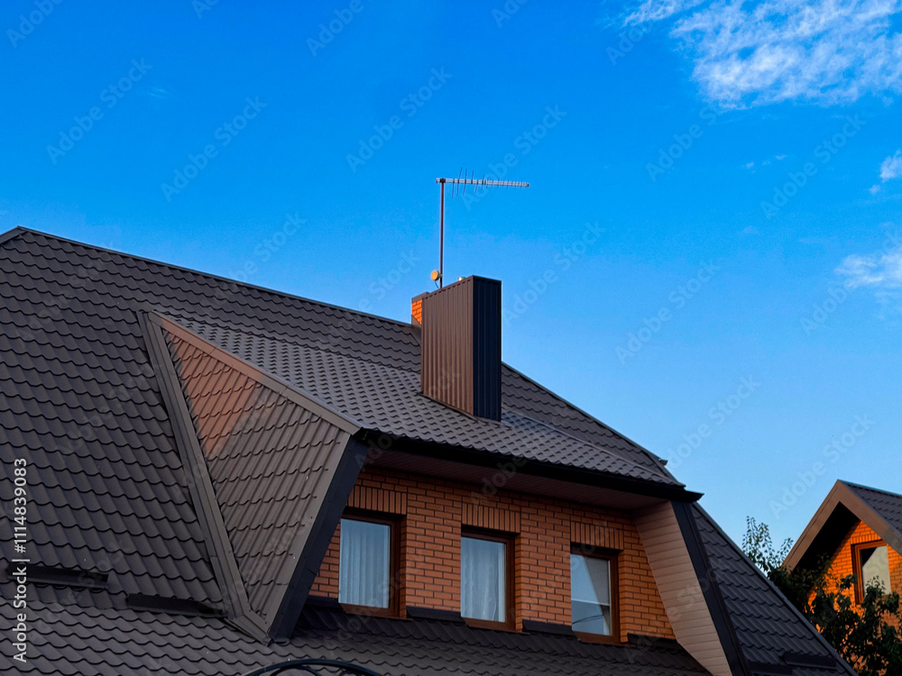 Roofing the house with metal tiles. The chimney in the kitchen is made of metal profile