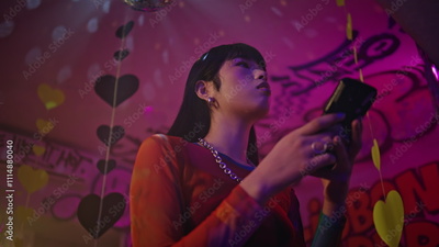 Korean woman reading cellphone message at club lights closeup. Serious brunette