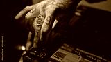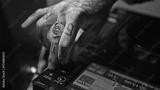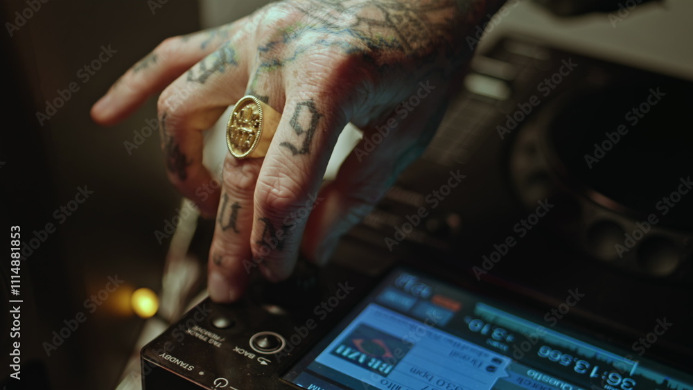 Closeup disc jockey hand with ring on detailed music controller. Dj tattooed