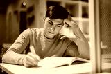 A high school student intensely focuses on studying, writing in a notebook. The classroom environment reflects concentration and academic dedication.