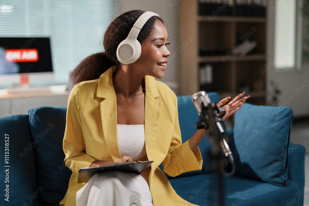 woman in yellow blazer hosting podcast with headphones and microphone in modern studio