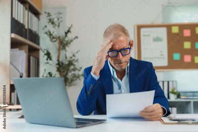 stressed businessman in blue suit reviews documents at his desk in modern office