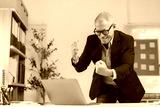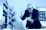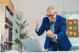 joyful businessman in blue blazer celebrates success while standing at his desk with laptop