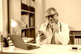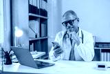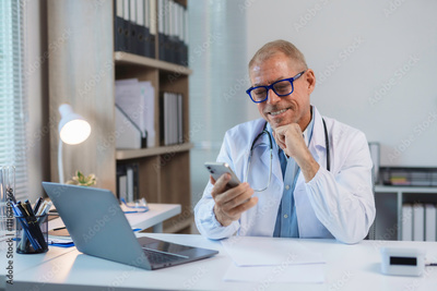 smiling doctor in white coat uses smartphone at his desk in modern office