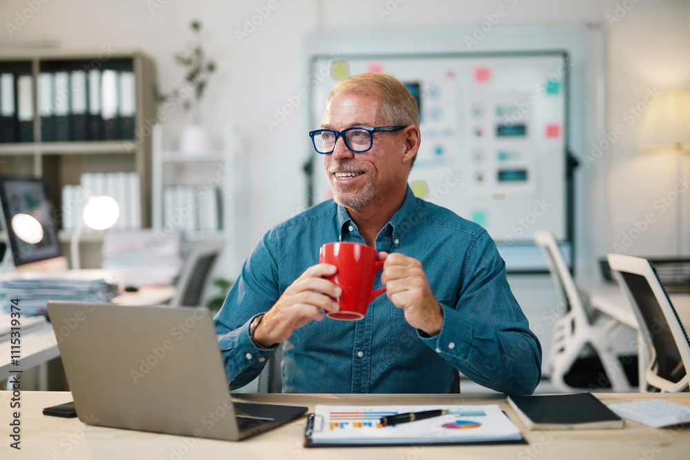 cheerful senior man in glasses holding red mug while working on laptop in modern office