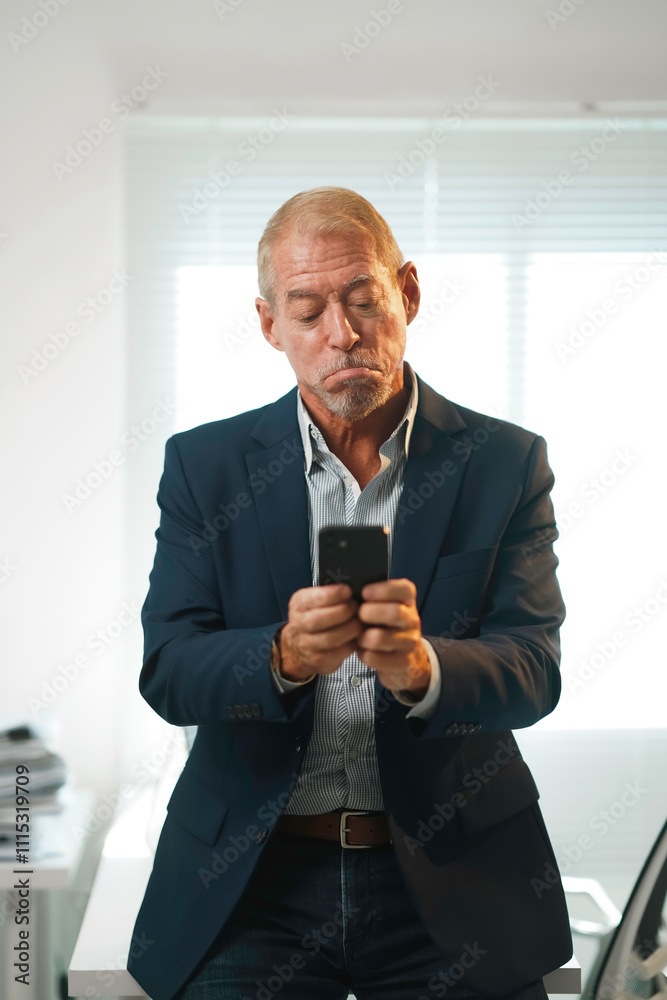 mature businessman in suit looks at his smartphone with focused expression in bright office