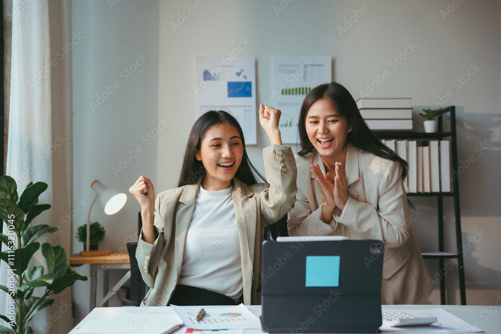 Two cheerful businesswomen celebrating success while working on laptop in modern office