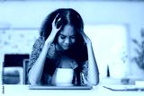 frustrated woman holding her head while working on laptop in modern office