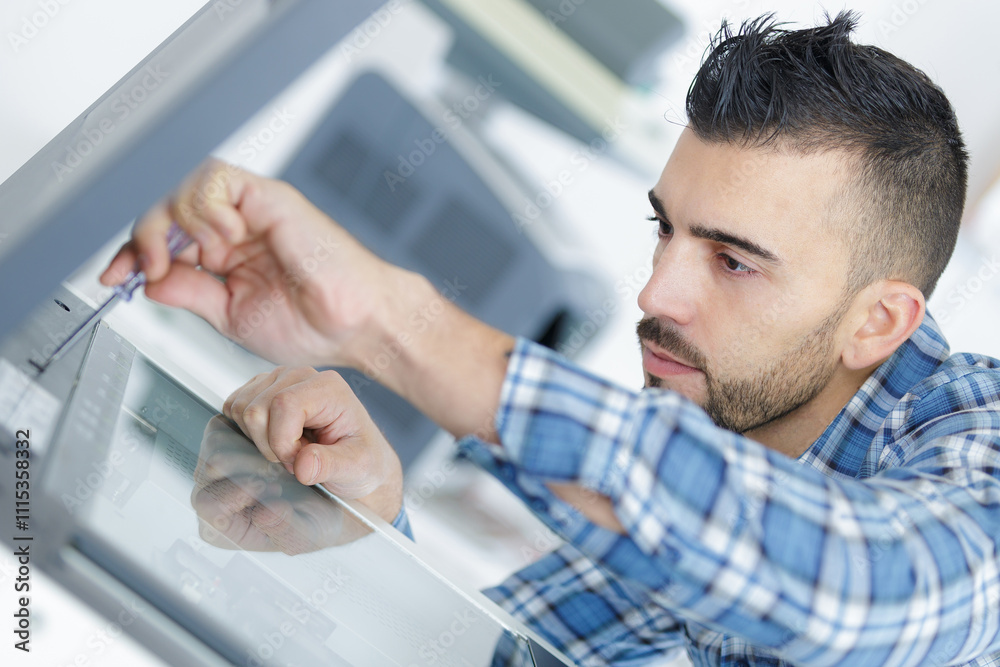 man repairing photocopier using screwdriver