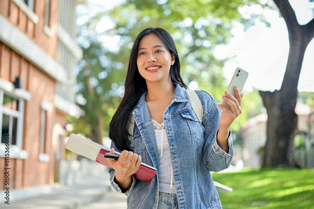 A smiling Asian female college student on her way to class in the morning, holding her smartphone.