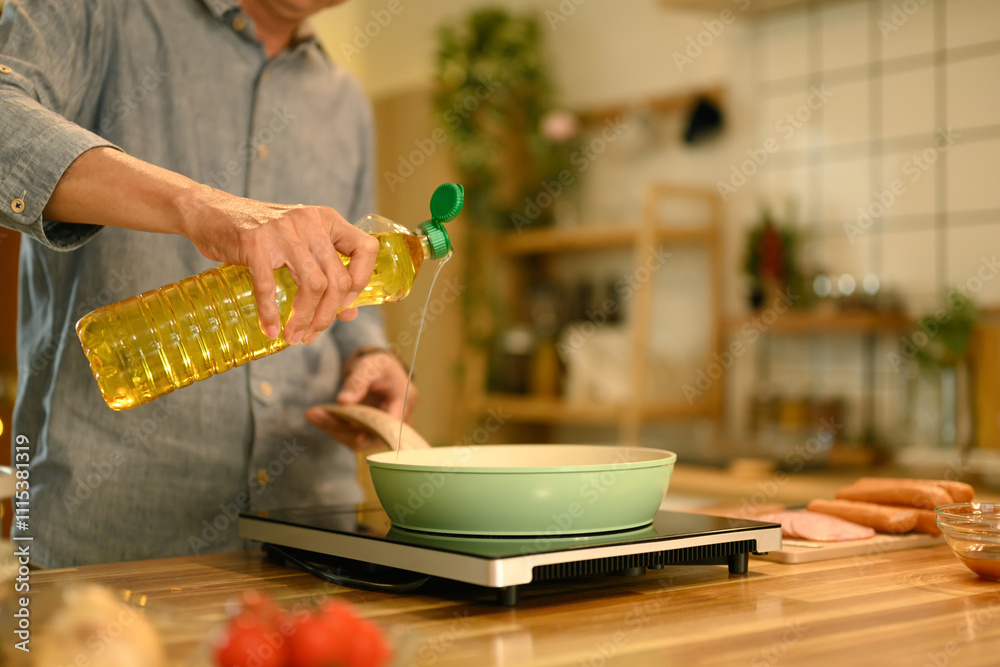 Senior man pouring cooking oil into a green frying pan while preparing to cook in warm kitchen